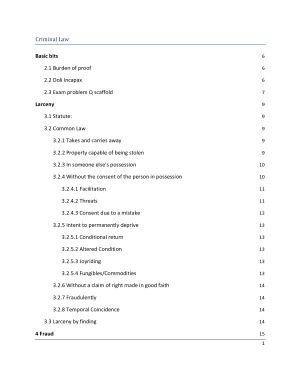Concise notes i used for the Criminal Law and Procedure Examination 2017, final subject mark was 82% Indexed notes that integrate content, caselaw and statute, covering: - An Exam Scaffold - Larceny - Fraud - Assault - Sexual Assault - Attempt - Complicity - Defences (Automatism, Insanity, Intoxication, Self-Defence, Duress, Necessity).