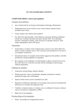 If you plan to answer the problem question (and not the essay question) then here is everything you need for the IT Law Final Exam. The notes cover all four topics examined in the final exam, including: 1) Cybercrime: a) legislation and b) case law 2) Intellectual Property 3) Copyright 4) Circuit Layouts and Trade Secrets