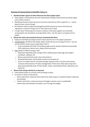 Summary notes from the each lecture formatted in bullet points. Topics covered are: -Overview of macronutrients in food -Obesity -Food classification -Food allergies and intolerances -Diabetes -Dietary guidelines and NRVs -Nutrition and CVD -Nutrition and cancer -Osteoporosis -Nutrition in pregnancy and infancy -Childhood nutrition -Adolescent nutrition -Food security in aboriginal communities -Food-borne illnesses and food fortification -Cultural aspects of our food supply and the relevance of dietary patterns -Australia's food system -Dementia and effective communication amongst dementia patients -Iodine and outcomes of mandatory fortification -Food implications - animal welfare and environmental issues -Food regulations: labels and health claims