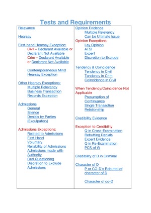 LAWS399 HD Evidence Law Summarised Notes Achieved total mark of 85 (High Distinction). Consists of tables of legislations and case law for each topic of Evidence Law, for easier application to Hypothetical problems. Total Pages = 81 Topics Covered: 1. Relevance 2. Hearsay 2A. First-hand Hearsay Exception: i)Civil ā Declarant Available or Declarant Not Available ii)Crim ā Declarant Available or Declarant Not Available 2B. Contemporaneous Mind Hearsay Exception 2C. Other Hearsay Exceptions: i)Multiple Relevancy ii)Business Transaction Records Exception 3. Admissions 3A. Silence 3B. Denials by Parties (Exculpatory) 4. Admissions Exceptions: 4A. Related to Admissions 4B. First Hand 4C. Voluntary 4D. Reliability of Admissions 4E. Admissions made with Authority 4F. Oral Questioning 4G. Discretion to Exclude Admissions 5. Opinion Evidence 5A. Multiple Relevancy 5B. Can be Ultimate Issue 6. Opinion Exceptions: 6A. Lay Opinion 6B. ATSI 6C. Expert 6D. Discretion to Exclude 7. Tendency & Coincidence 7A. Tendency in Civil 7B. Tendency in Crim 7C. Coincidence in Civil 8. When Tendency/Coincidence Not Applicable 8A. Presumption of Continuance 8B. Single Transaction 8C. Relationship Evidence 9. Credibility Evidence 10. Exception to Credibility 10A. Q in Cross-Examination 10B. Rebutting Denials 10C. Expert Evidence 10D. Q in Re-Examination 10E. Previous Consistent Statement of W 11. Credibility of D in Criminal 11A. Character of D 11B. P or CO-Dās Rebuttal of character of D 12. Character of co-D