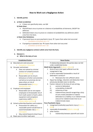 Everything you need to know about how to work out all negligence actions. Comprehensive and accurate including relevant cases and legislation for each action. Colour coded and easy to read. Perfect for end of semester exam study.