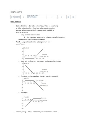 I obtained a whopping 90 scores in this units. Needless to say, these notes contain all the information that I used to achieve this high mark. (Proof by downloading Sample notes) Everything from option/forwards/futures to trading strategies are included. This is a comprehensive compilation of all information covered from week 1 to 12 of Derivatives. You want a high mark? you've come to the right place! Note that there is limited information on spreadsheet materials as I cannot provide them on here. Included: - formatted, laid out information for easy understanding - An abundance of images, tables, graphs to assist in interpreting the information included - everything covered from w1 to w12 that you need to know to achieve my mark! (updated as of sem 2, 2017) Topic list: 1. Introduction 2. Future/Forward prices 3. Hedging with Futures 4. options 5. option trading 6. N/A 7. Binomial Option Pricing 8. Black Scholes Merton model 9. Options on stock indices 10. Option hedging and greek letters 11. N/A 12. Conclusion