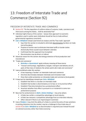 Well formatted, very comprehensive, easy to follow HD exam notes for LAW2111. Inclusive of all cases on reading guide as of semester 2 2017, refers to relevant sections of Constitution and contains all sections of other legislation in reading guide. Includes case summaries. Topics covered: -Fundamental concepts, institutions and instruments -State legislative power -Making State Constitutions rigid - manner and form requirements -General principles of Commonwealth legislative power -External affairs power (s51(xxix)) -Limits of Commonwealth power over the States -Commonwealth grants to the States (s96) -Inconsistency (s109) -Executive power of the Commonwealth -Chapter III of the Constitution -Implied political freedoms -Freedom of interstate trade and commerce (s92)