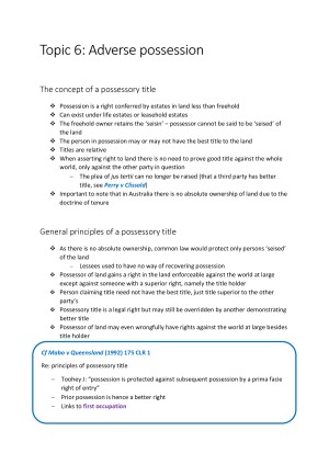Well formatted, very comprehensive, easy to follow exam notes for LAW2112. Inclusive of all legislation and cases on reading guide as of semester 1 2017. Includes case summaries. Achieved grade of 77. Topics covered: -The concept of property -Fragmentation of property interests -Introduction to land title -Introduction to legal and equitable interests -Doctrine of tenure and estates -Adverse possession -Land transfer and formalities -Leasehold estates -The creation of leasehold interests -Contractual licences -Easements -Restrictive covenants -Mortgages