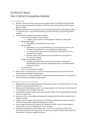 Notes from lectures one to twelve, includes graphs from the textbook. Very detailed and include own work. Topics covered: - opportunity cost and comparative advantage - perfect competitive markets (main topics include: supply curve, demand curve, price elasticity, market equilibrium, price ceiling, price floor, exports and imports) - imperfectly competitive markets (main topics include: monopoly, government regulation, market power, cartel games, coordination game, externalities and public goods)