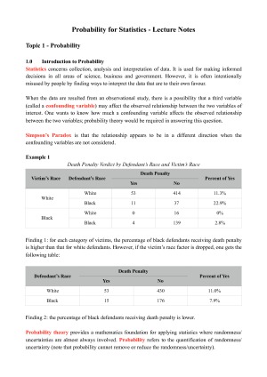This is a comprehensive compilation of information from MAST20009 lectures, the textbook, tutorials, practicals, workshops, problem booklets and other useful sources I found online to aid my study. Each section (particularly the harder concepts) is supported by easy to read and understand dot points, diagrams, pictures and thorough example exam-style questions. Includes all summarised formulae required to know for each topic. Topics included are: 1. Classic probability model (Bayes' Theorem, conditional probability, relative frequency) 2. Discrete distributions (pmf, binomial, negative binomial, hypergeometric, geometric, poisson, uniform, mgf's) 3. Continuous distributions (definitions, pdf, cdf, exponential, gamma, chi-square, uniform and beta distributions) 4. Multivariate distributions (marginal and joint pdf/pmf, multivariate transformations, independent random variables) 5. Normal distribution (summary of normal distribution, mgf, approximations of discrete distributions using normal, limiting mgf functions).
