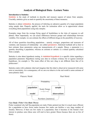 This is a comprehensive compilation of information from MAST20031 lectures, the textbook, tutorials, practicals, workshops, problem booklets and other useful sources I found online to aid my study. Each section (particularly the harder concepts) is supported by easy to read and understand dot points, diagrams, pictures and thorough example exam-style questions. Includes all summarised formulae required to know for each topic. Topics included are: 1. Summary statistics, types of data 2. Probability models 3. Sampling and estimation 4. Principles of frequentist inference (one sample t-tests, two-sample t-tests, hypothesis testing) 5. Design of biological experiments 6. Linear models (regression) 7. Multiple linear regression (interaction) 8. General linear models (logistic regression) 9. Model selection (AIC, BIC, cross-validation) 10. Bayesian inference