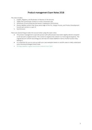 This is Product Management 2018's comprehensive notes to prepare for the exam. It contains: 1. Graphs, diagrams, and illustration of theories in the lectures 2. Tables that summarizes content in a more convenient way 3. Definitions of terms/theories that weren’t explained in the lectures 4. Clearly labelled content that shows what stage of the PLC, Design Process, and Product Development Funnel each section is a part of 5. Fjord lectures Topics covered: Market Analysis, Conceptual Analysis, Product Strategy, Product Development, Program Strategy, Launch, Post-Launch Activities, and Monitoring & Repositioning