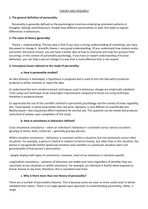 Comprehensive notes on examinable content covering the core learning outcomes as detailed in the 2017 study guide from week 1 - 11 W1- Research and theory W2 - Psychodynamic approach W3 - Biological approaches W4 - five factor model W5 - Humanistic approaches W6 - Behaviourist approaches W7 - Personal construct theory W8 - Social cognitive theories W9 - Attachment W10 - CAPS W11 - Personality disorders