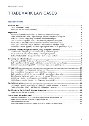 Detailed case summaries of all the trademark cases included in the 2017 Unit Guide, with comparison images and important principles highlighted. Given the lack of past exams available, learning the cases becomes important to analogise and distinguish any fact pattern that arises in the exam. Ideal for exam preparation and working through the portion of the trademark question that will be provided before the exam. These notes include: What is a trademark? Registration; Substantial identity, deceptive similarity, likely deception & confusion; Infringement; Parallel importation; Rectification of the register & removal for non-use; Licensing and ‘Authorised users’.
