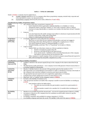 clear and concise notes that covers topics 1 - 11 • Topic 1: Introduction to corporations law • Topic 2: Incorporation and its effects • Topic 3: Types of companies • Topic 4: The constitution and the replaceable rules • Topic 5: Share capital, debt capital and dividends • Topic 6: Directors, members and corporate decision-making • Topic 7: Corporate contracting • Topic 8: Directors’ duties • Topic 9: Consequences of contravention and relief from liability • Topic 10: Members’ remedies • Topic 11: Corporate mortality
