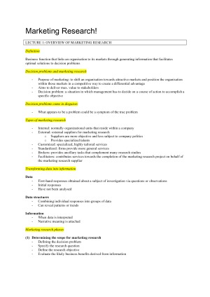 Extensive textbook & lecture notes! Helped me get a HD. Low page count as notes are presented in 2 columns. LIST OF TOPICS: 1. Research questions and data 2. Interviews and focus groups 3. Making sense of qualitative data and sampling 4. Surveys 5. Construct measurement, questionnaires and supplements 6. Coding, Editing and Preparing Data, and Preliminary Data Analysis; Preparing the Marketing Research Report and its Presentation 7. Data Analysis: Testing for Difference 8. Data Analysis: Testing for Association 9. Data Analysis: Testing for Independence 10. Observation and its Variants and Experiments and Test Markets 11. Information-driven Technology and the Research Process