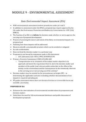 These notes focus on the later modules (Modules 6 - 10) as the first weeks are purely context based and are not assessed in the final problem question exam. Received an overall Distinction for the unit using these notes. They comprehensively cover all relevant provisions from the Environmental Planning and Assessment Act 1979 (NSW) and are formatted in a step by step format that allows you to easily answer problem questions. Includes important case studies such as Hunter Valley Speleological Society and Wingecarribee Shire Council cases. CONTENTS: (1) Environmental Planning Instruments (Context, Section 5 - EPA Act) (2) State Environmental Planning Policy (SEPPs) (3) Local Environmental Plans (LEPs) (4) Development Assessment and Approval ('Development permissible with consent' & Complying Development) (5) State and Regional Development/Major Projects (6) Environmental Assessment - EIA (7) Land and Environment Court