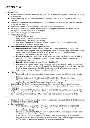 Torts notes derived from lectures and supplemented with summarized material from key cases, tutorials, and textbooks. Extremely helpful for weekly quizzes, problem question and final multiple choice exam. Contexts: (1) Introduction (2) Negligence / Duty of Care (3) Duty of Care (4) Standard of Care (5) Damages - Causation and Remoteness (6) Concurrent Liability (7) Defences