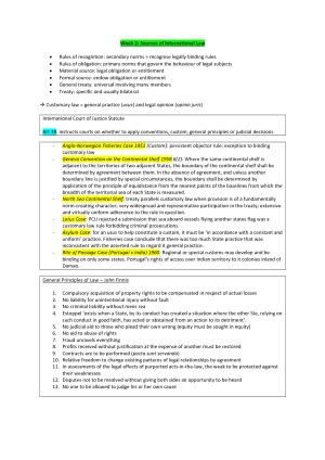 Extremely useful notes which is all you will need to succeed in the course. Summarised well (not excluding any necessary detail). I have attached a sample below (week 2 content) however it is the least sufficient page. Because so much content is covered on one page, I put this sample up as it holds the least information for people online to copy from. Thoroughly recommend purchasing if you need quick access to: - Important treaty articles highlighted in blue - Case law highlights in yellow - Other significant points in dot points If you require detailed notes I am also uploading my 114 pages of international law notes for purchase.