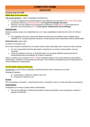 A comprehensive & colour-coded summary for LAWS4245 IT Law Problem Questions. These include the general context and legislation required to complete the problem questions for your final exam re Cybercrime & Intellectual Property! The following are included in my summary: - Cybercrime Act 2001 - Criminal Code Act 1995 - Security Legislation Amendment (Terrorism) Act 2002 - Crimes Legislation Amendment (Telecommunications Offences & Other Measures) Act - Evidence Act 1995 (Cth) - Powers granted the Cybercrime Act - Case summaries - Patent Act & steps involved to establish patentable inventions - Copyrights Act & steps involved to establish CR, infringements & remedies - Circuit Layouts Act and steps to establish the nature of EL rights & infringements - Trade Secrets & steps to establish breach of confidence - Contract Law & Open Source (Brief)