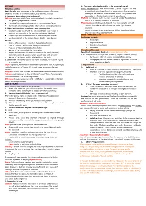 A comprehensive and colour-coded summary for all of the content covered in LAWS2204 Property Law. It includes all the steps you need to answer the question sufficiently as well as brief case summaries for your referral. I have also included some suggested answers in there which will aid during the exam. The following main content are included: - Fixtures - Lost & Found - Torrens Land (Registered & unregistered) - Leases (Types of leases, at sufferance, registered, unregistered & covenants) - Mortgages (Power of sale & mortgage remedies) - Priority Disputes for URI v RP. (Various fraud exceptions, short-term leases, inconsistent legislation, actions in personam, registar-general, volunteers and estates/interests recorded in folio) - Priority Disputes for URI v URI (Registable dealing, registered proprietor, legal estate, first in time, other postponing conduct and Latec complication) - Co-ownership (features of joint tenancy, statue, tenants in common and severance of joint tenancy)