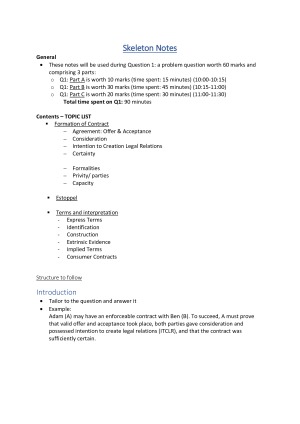 Comprehensive exam skeleton notes for Contracts A. Pursuant to the exam format, these notes allow for working through each issue in chronological order. You apply the notes to the facts in the exam, and makes it simply a fact of putting them together. I printed these notes out and stuck them in my exam booklet. These are different to just summary notes, as they are more concise and its word limit has been purposely limited for, again, exam situations. At date of release, results yet to be publish. Found them very helpful in the exam though.