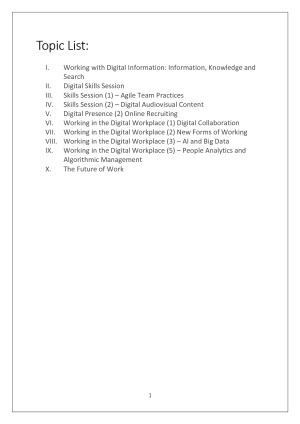 ★ COMPREHENSIVE INFS1020 Notes ★ ★ HD Notes ★ TOPIC LIST: I. Working with Digital Information: Information, Knowledge and Search II. Digital Skills Session III. Skills Session (1) – Agile Team Practices IV. Skills Session (2) – Digital Audiovisual Content V. Digital Presence (2) Online Recruiting VI. Working in the Digital Workplace (1) Digital Collaboration VII. Working in the Digital Workplace (2) New Forms of Working VIII. Working in the Digital Workplace (3) – AI and Big Data IX. Working in the Digital Workplace (5) – People Analytics and Algorithmic Management X. The Future of Work