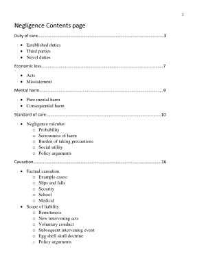 Has everything you need to know for a negligence exam problem only (duty of care through to causation). This covers negligence as the topic only. Step by step guidelines. Easy to read. Includes all cases that a mandatory, all additional cases from the textbook, lecture notes, class notes and textbook readings. Achieved a distinction for this subject.