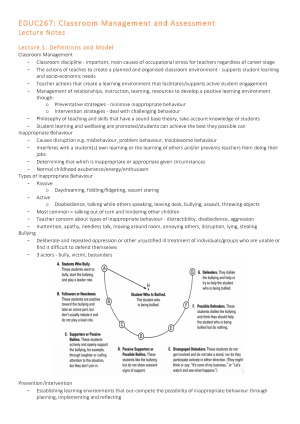 EDUC267 Full Lecture Notes (1-20) Topics Include: - Definitions, Models, Behaviour - Prevention - Climate/Culture, Environment/Practice - Classroom Management - Behaviour, Cognitive Behavioural, Psychoeducational, Social Justice, - Assessment - Designing, Marking/Grading, Feedback, Summarising - Curriculum/Pedagogy/Assessment, Reporting