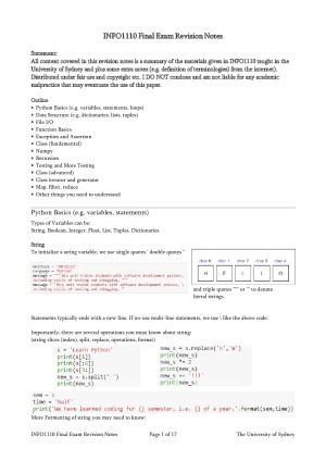 This is a comprehensive summary of this unit made by a private tutor for programming. I have done the java programming unit last year, hence I have some idea of how to the final exam for INFO1110 Python unit. This is very helpful for preparing your final exam and checking anything you should know but missed. Every point is with at least an example. Also, some tips. Outline Python Basics (e.g. variables, statements, loops) Data Structure (e.g. dictionaries, lists, tuples) File I/O Function Basics Exception and Assertion Class (fundamental) Numpy Recursion Testing and More Testing Class (advanced) Class iterator and generator Map, filter, reduce Other things you need to understand Please see the example notes for a preview. Good Luck for your exam!
