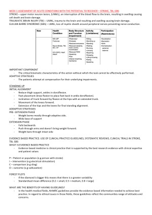 Neurological physiotherapy final exam notes to prepare you for the final exam. this document covers material from weeks 1 through to 13 including subjects such as: - assessment of acute conditions. - introduction to rehabilitation. - reaching and manipulation. - sitting and standing biomechanics. - mechanism and medical management of guilian barre syndrome. - weakness as a result of muscle activation. - loss of coordination. - loss of sensation. - spasticity and contraction. - secondary impairments. - non motor impairments. - clinical reasoning. - what research has told us (for and against).