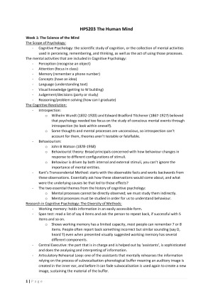 Comprehensive exam notes based on the weekly learning objectives. All topics covered: science of the mind, attention, working memory, encoding and retrieval, remembering complex events, concepts, visual knowledge, judgement and reasoning, problem solving and intelligence, and conscious and unconscious thought.
