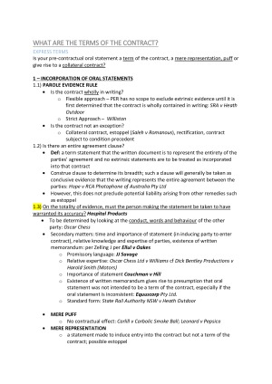 Notes to study off of for final exam, brief and all you need to do problem questions with. -Express and implied terms of contract - Construction of contract (privity, exclusion clauses, part-performance) - Termination (process and consequences) - Breach - Repudiation - Frustration