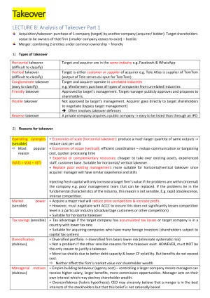 This note covers all 12-week lectures of Semester 1, 2018. I achieved a score of 95 (H1). I have adjusted the order of the lectures and combined those relevant lectures into a big topic, which hopefully will make it much easier to see the big picture. I have put as many explanations as possible so this note is very detail-oriented and in-depth. The content covers knowledge of lectures, textbook readings, tutorial questions and practice exams. I used tables, diagrams and colors to make it easy for you to follow and notice the important points. I recommend you to refer to the note for any concepts you find difficult to understand and use this as a guide when doing practice questions! I hope this will help you achieve a high score in CFDM! Best of luck! ****************************************************** Topics covered include: Financing decision + Debt financing + Equity financing + WACC & capital structure Investing decision + Assessing mutually exclusive projects + Sensitivity, break-even, decision tree + Real Options Payout decision + Payout policy Takeover + Analysis of takeover Part 1 + Analysis of takeover Part 2 Corporate Restructuring + Corporate restructuring Risk management + Risk management