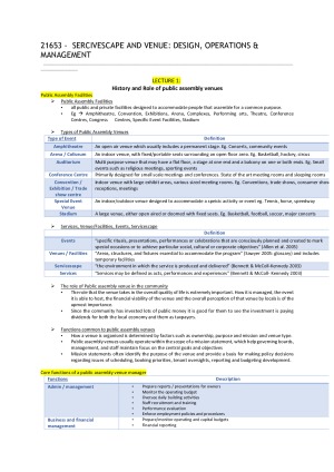 These notes include all lecture slides as well as additional information from the textbook. Topics include: 1. history and role of PAV 2. Venue ownership/mangement 3. design, planning, accesibility 4. booking the venue / marketing and sales 5. Event and Ancillary Revenue Sources / Venue and Operations and Services 6. Event Management and Services 7. Risk, Safety and Security