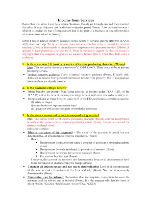 About the notes: - These are the mid-semester exams for taxation law and policy. - Each of the covered topics includes an introduction to be used in an exam as well as a detailed hypo structure. - The notes included key points from all the relevant cases as well as explanation of the importance and relevance of each topic. About me: - I am a third year law student with a high H1 average. - I have received several prizes for my academic achievements, including a scholarship covering the full tuition of my law degree, for placing as one of the top 2 students during my first year at law school. - I was a STS tutor. - I have been successful in securing numerous clerkships at top tier firms. - I have a graduate job lined-up at a top tier international firm. Topics covered in the notes: - Income indicia - Income from services - Income from business