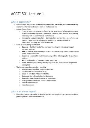 Detailed and in-depth notes from each week. Contents 1. Introduction to Financial Accounting 2. Measuring and Evaluating Financial Position and Financial Performance 3. The Double Entry System 4. Record Keeping 5. Accrual Accounting Adjustments 6. Internal Control and Cash 7. Accounts Receivable and further record-keeping 8. Introduction to Inventory and Non-current assets 9. Financial Reporting Principles, Accounting Standards and Auditing 10. Financial Statement Analysis 11. Management Accounting: Introduction and Cost Concepts 12. Management Accounting: CPV Analysis