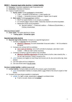 Includes detailed explanations that deliver all essence from lectures and textbook readings throughout the semester. Some Chinese annotations and color codes, which separate statutory legislations from general law cases, are used to prompt insightful study. Well-organised with headings and subheadings by weekly content. Topic list: Week 1 - Introduction to the subject Week 2 - Business planning, constituting to companies Week 3 - Decision making in companies Week 4 - Member meetings and decision-making Week 5 - Transacting by companies Week 6 - Company directors' and officers' duties Week 7 - Dividends, good faith and proper purpose Week 8 - Duty to avoid conflicts of interest Week 9 - Shares and capital maintenance Week 10 - Reporting and disclosure Week 11 - Consequence of breach of duty, members' remedies