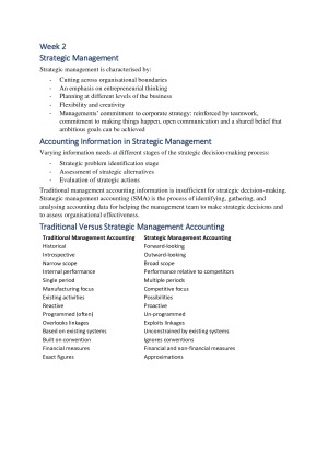 Topics: Introduction to Strategic Management Accounting Strategy Management and Control Strategic Change and Flexibility Budgeting Costing Value Chain Performance Financial Measures of Performance Non-Financial Measures Excluding weeks 5 and 6 due to research topic and public holiday.
