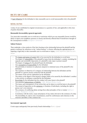 Notes to study off of for final exam, brief and all you need to do problem questions with. - All relevant elements of negligence (duty, breach, causation, defences and damages) - All relevant legislation and cases detailed more heavily throughout the notes themselves. - Relevant survival claims, compensation to relatives claims and loss of services claims.