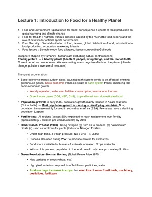 - Includes chronological notes for all 12 weeks, including guest forums held (forum topic may vary year to year but information is relevant to other course material) - Include all information from tutorial readings and main points covered during tutorials - List of all lecture topics covered: The Great Acceleration (Population Growth), Climate change & Food Security, Limiting/Declining Water Supply, Green Revolution, Biofuels, Urbanization, Food Choices, Food Environment, Climate Change & Impacts of Food Production, Food Security, Food & Nutrition, Micronutrients & Bioactive Compounds, Food for Optimal Health, Evolution of Obesity, Economic Perspectives on Global Food-related Issues, Food Insecurity, Theories of Famine, Genetically-modified foods, Sustainable City Region Food Systems, Adverse Reactions to Food, Designing Food for Taste & Health, Chocolate & Coffee. - Forum topics covered: Sports Nutrition, How the Consumer Shapes the Food Industry, The Politics of Obesity