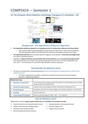 Struggling getting through all 12 weeks of lecture. If you don't want to attend the 6pm and 7pm lectures, take these concise summary notes that cover all 1000 slides used in the lectures. These are the notes for you to ace that final exam and save the stress! Topic List: § Medical data sampling and acquisition § Medical data processing and analysis § Medical data registration and fusion § Multi-modal medical image computing § Medical data storage and retrieval § Medical data modelling and simulation § Molecular imaging and modelling § Molecular imaging and applications § Medical image computing: from macro to micro § Advanced medical image computing