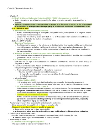 These Public International Law notes combines material from lectures and readings. The structure and logic is very clear for each topic thus easy to follow. A detailed account of principles is contained in these notes, as well as key cases and statutes. Case summaries include facts, decision and principles. The key takeaways are all highlighted and colour-coded for clarity purpose. The sample note is a part on the topic of diplomatic protection. It demonstrates the overall quality of the notes. Topics: Nature of PIL International legal personality and Statehood Title to territory Sources of international law The Law of Treaties Public International Law and Municipal Law State Jurisdiction Immunity from jurisdiction State Responsibility Diplomatic Protection Use of Force