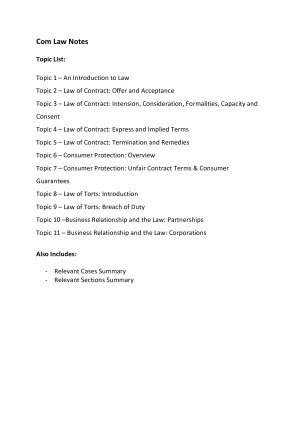 Complete Week 1-11 of both lecture content, and a full list of relevant cases and sections of legislation. My lifeline for this subject were these notes.
