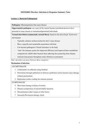 These notes cover all the lecture content covered in MIIM20002 as well as some of the essential practicals which are assessed in MSTs throughout the year. I would recommend using these notes in conjunction to the lecture slides and bringing them to lectures to annotate on them. Topics included in this set of notes: - Review of Principles of Infection & Immunity - Gastrointestinal Infections - Mucosal Immunity & Human Microbiome - Respiratory Tract infections - Sexually Transmissible infections - Health Care associated Infections Microbial Interactions and Symbiosis