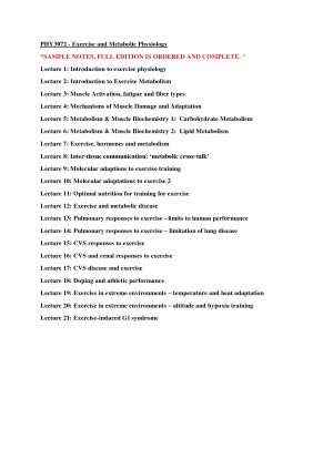 These notes were compiled by a small group of authors. Created by a small group of learners and authors, the notes have been further edited to accommodate for different kinds of learners from day 1, mid-semester exams and SWOTVAC, to help with study and training. The notes contain comprehensive summaries and explanations for each lecture to assist with understanding and revision. With due diligence, the use of these notes will almost guarantee a HD. Authors attained a HD grade and the utilisation of these notes aided our study significantly. Topics Covered: Lecture 1: Introduction to exercise physiology Lecture 2: Introduction to Exercise Metabolism Lecture 3: Muscle Activation, fatigue and fiber types Lecture 4: Mechanisms of Muscle Damage and Adaptation Lecture 5: Metabolism & Muscle Biochemistry 1: Carbohydrate Metabolism Lecture 6: Metabolism & Muscle Biochemistry 2: Lipid Metabolism Lecture 7: Exercise, hormones and metabolism Lecture 8: Inter‐tissue communication: 'metabolic cross‐talk' Lecture 9: Molecular adaptions to exercise training Lecture 10: Molecular adaptations to exercise 2 Lecture 11: Optimal nutrition for training for exercise Lecture 12: Exercise and metabolic disease Lecture 13: Pulmonary responses to exercise - limits to human performance Lecture 14: Pulmonary responses to exercise - limitation of lung disease Lecture 15: CVS responses to exercise Lecture 16: CVS and renal responses to exercise Lecture 17: CVS disease and exercise Lecture 18: Doping and athletic performance Lecture 19: Exercise in extreme environments - temperature and heat adaptation Lecture 20: Exercise in extreme environments - altitude and hypoxia training Lecture 21: Exercise-induced GI syndrome