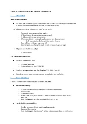 These notes were all I used in the Evidence Law exam in T2 2017. They comprise notes from the: - Lectures - Textbook - Extra readings - Cases and legislation They have everything you need to know for the exam, and all of the key principles are highlighted. The thorough, yet clear and concise, case summaries from my reading of all of the prescribed cases will save you a lot of time throughout the semester. My notes include ALL topics taught in T2 2017, including: 1. Introduction to the Uniform Evidence Act 2. Verbal Evidence 3. Documents and other Evidence 4. Relevance 5. Hearsay 6. Admissions 7. Opinion Evidence 8. Tendency and Coincidence Evidence 9. Credibility and Character Evidence 10. Privileges 11. Mandatory and Discretionary Exclusions