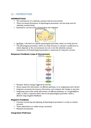 These notes comprehensively cover the lecture content of Human Physiology. They go into extra detail for harder concepts and for concepts often used in 'trick questions'. Images are included to help your learning. Topics Covered: - homeostasis - membrane potential, action potentials, synaptic transmission, neuronal circuits - vision - motor control, skeletal muscle, cardiac muscle, smooth muscle - autonomic nervous system - endocrine system - cardiovascular system, cardiac cycle, blood pressure - respiratory system - renal function and kidneys - thermoregulation - glucose metabolism - digestion - reproductive system Using these notes I got a score of 93 in the subject.
