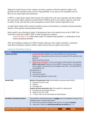 Summarised important concepts in a easy to read table form. Help you review & study easily for investment. Topic incl: - Optimal Portfolio Choice - Capital Asset Pricing Model - Index Model - APT and Multi-factor model - Portfolio Performance Evaluation - Fixed Income Fundamentals - Managing Fixed Income - Floating Rate Bond and Class Adjustment