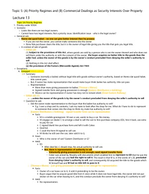 These IPCL notes combines material from lectures and readings. The structure and logic is very clear for each topic thus easy to follow. A detailed account of principles is contained in these notes, as well as key cases and statutes. Case summaries include facts, decision and principles. The key takeaways are all highlighted and colour-coded for clarity purpose. For some important cases, I have also included a one-sentence summary which is very useful in exams. The sample note is a part on the topic of Topic 5(A) Priority Regimes. It demonstrates the overall quality of the notes. Topics: Topic 1 - (A) The Concept and Function of “Property” and (B) Real Property - Introduction to Real Property Topic 2: Personal Property - Introduction to Choses in Possession Topic 3: Personal Property - Introduction to Choses in Action Topic 4: Assignment and Disposition of Interests Topic 5: (A) Priority Regimes and (B) Commercial Dealings as Security Interests Over Property