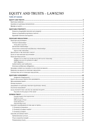 Comprehensive and detailed set of notes covering all topics in LAWS2385 EQUITY AND TRUSTS course - Perfectly organised, detailed and annotated - everything you need for the exam. Includes all topics with index and subheadings. Include summaries and references to the MOST RECENT (2018) textbook, legislation, case law and scholarly articles.