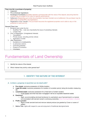 These notes were prepared initially for a mid-semester problem-question style exam, and then were extended for use in the final exam. They are a scaffold structure and arrange all relevant information in a problem question scaffold to allow for quick identification of relevant issues in timed exam situations. They cover the following topics: A. Fundamentals of Land Ownerships (nature of interest, priority) B. Torrens Title (nature of interest, priority, stopping registration) C. Co-ownership (classification, creation, rights, termination) D. Easements E. Profits a prendre F. Covenants G. Lease or Licence H. Mortgages (including flow chart diagram) I. Priority Notices The notes distinguish legal reasoning pathways between equity and common law for comprehensive answers. Students should note that these notes do not include case summaries, but rather refer to the relevant cases for each legal principle. For exams requiring more substantive application of case law these notes should be used in conjunction with a case-summary sheet.