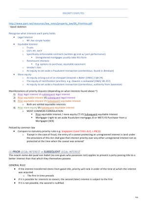 These notes are bomb, the result of compiling all notes from the semester, including lectures (Chris Nolan), LSS seminars, readings throughout the semester, and cases (facts/judgments + pinpointed quotes and references to judges' decisions - bonus points for this). Includes embedded instructions on how to approach a question + sentences to be copied out in the exam and altered depending on facts (takes key facts of a case, details it can be used to apply/distinguish from exam scenarios). Also pinpoints sections of legislation. INDEX (by topics) 1- Equitable Interests arising by Operation of Law 2- Mortgages 3- An Introduction to the Enforceability of Property Interests and the Torrens System 4 + 5- The Principle of Indefeasibility 6- Unregistered (Equitable) Interests under the Torrens System Priority Disputes 7- Co-Ownership