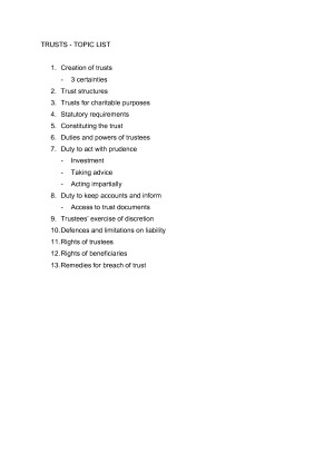 Comprehensive HD notes structured in accordance with the LAW4170 reading guide. Covers all topics and corresponding cases (summarised facts and principles) and relevant statutory provisions. Notes are simply structured to assist you in tackling exam questions with important or more challenging aspects highlighted. Includes page of additional notes to be aware of for an exam question. TOPIC LIST 1. Creation of trusts - 3 certainties 2. Trust structures 3. Trusts for charitable purposes 4. Statutory requirements 5. Constituting the trust 6. Duties and powers of trustees 7. Duty to act with prudence - Investment - Taking advice - Acting impartially 8. Duty to keep accounts and inform - Access to trust documents 9. Trustees’ exercise of discretion 10. Defences and limitations on liability 11. Rights of trustees 12. Rights of beneficiaries 13. Remedies for breach of trust